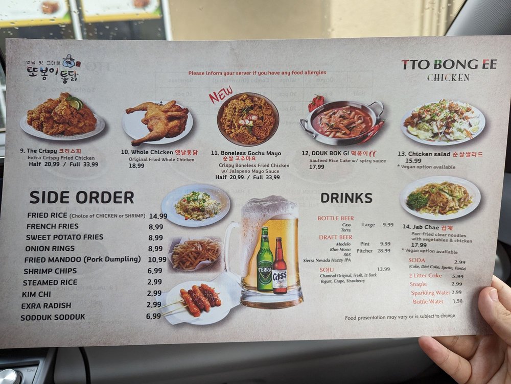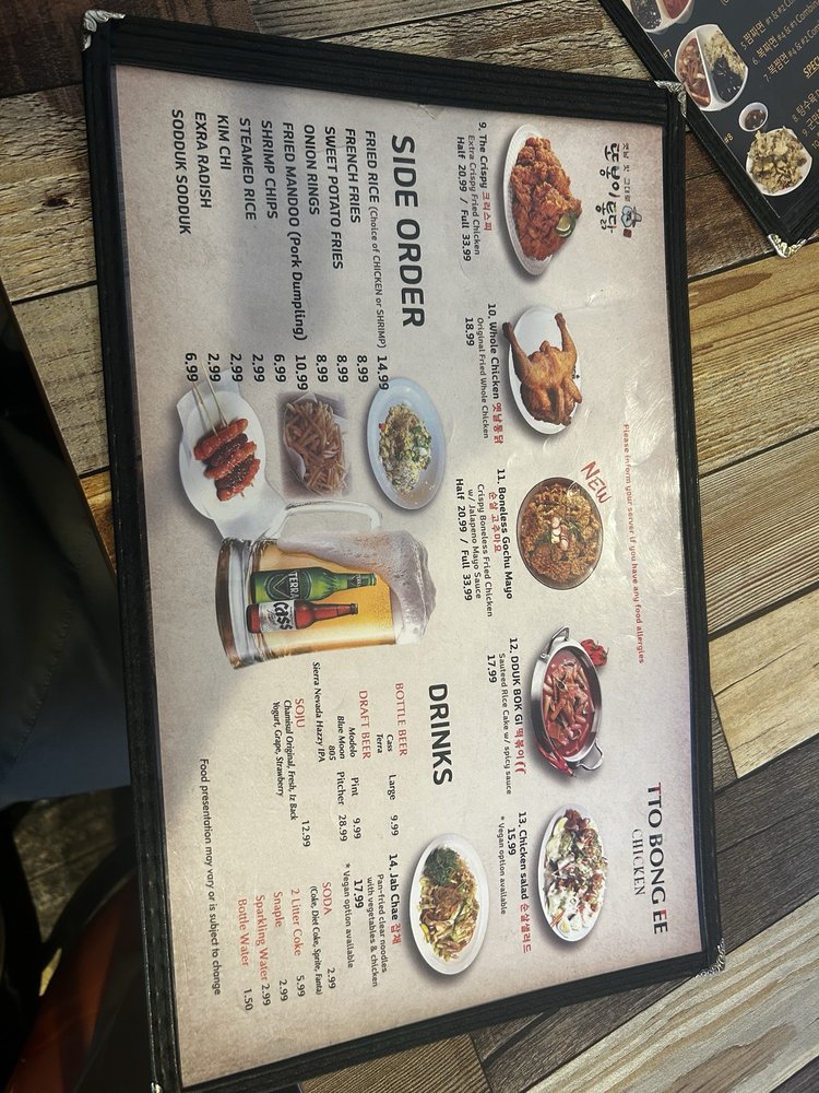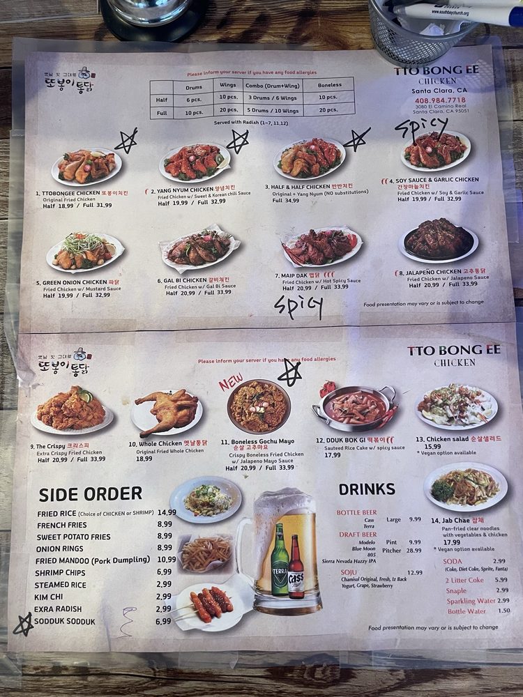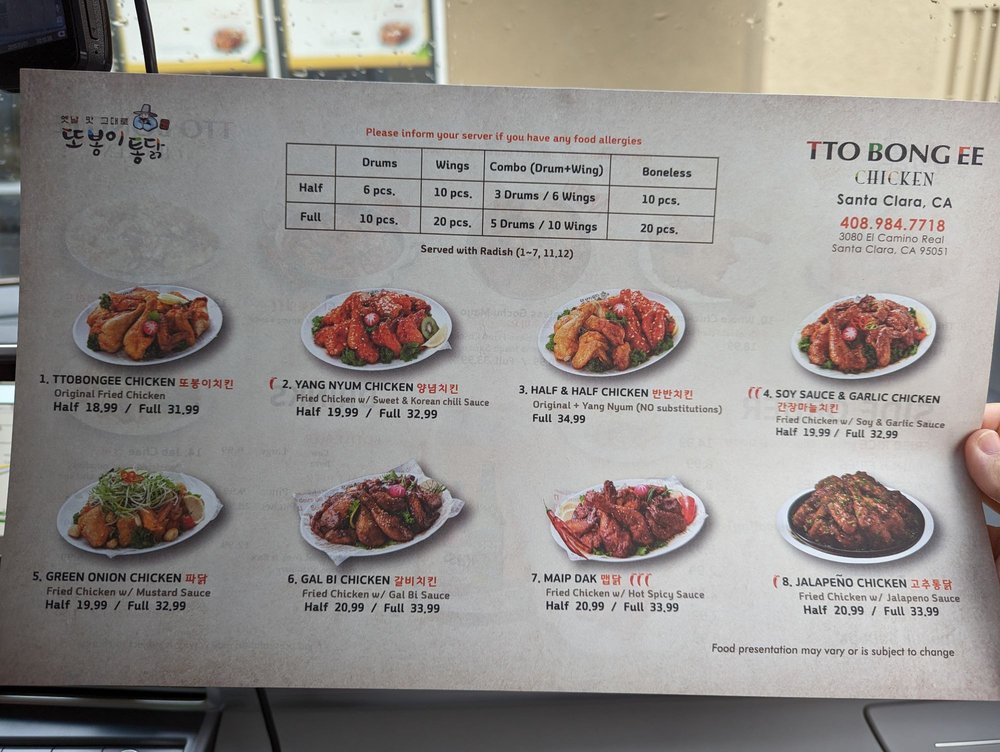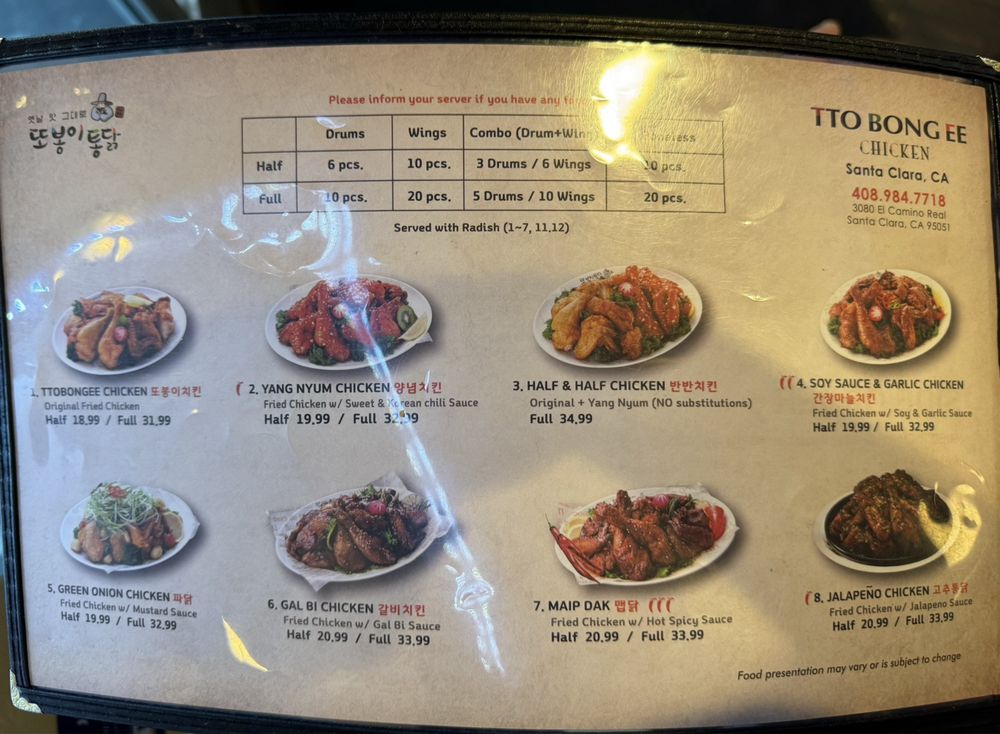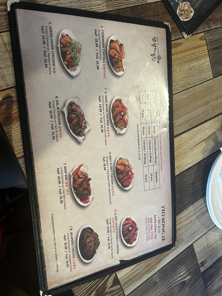Ttobongee Chicken, a Korean restaurant located in Santa Clara, CA, offers a variety of mouth-watering dishes with convenient amenities such as delivery, takeout, and wheelchair accessibility. The menu features classic favorites like Ttobongee Chicken Wings and Drums, as well as the flavorful Yang Nyum Chicken with sweet and spicy Korean chili sauce. Vegetarian options are available, along with a selection of sides like Fried Mandoo and Shrimp Chips. With a casual and trendy atmosphere, this restaurant is ideal for groups looking for a delicious dinner experience. Don't miss out on their unique offerings like the 5000UK drink and free Wi-Fi. Ttobongee Chicken is a must-visit destination for those craving authentic Korean flavors in a welcoming setting.